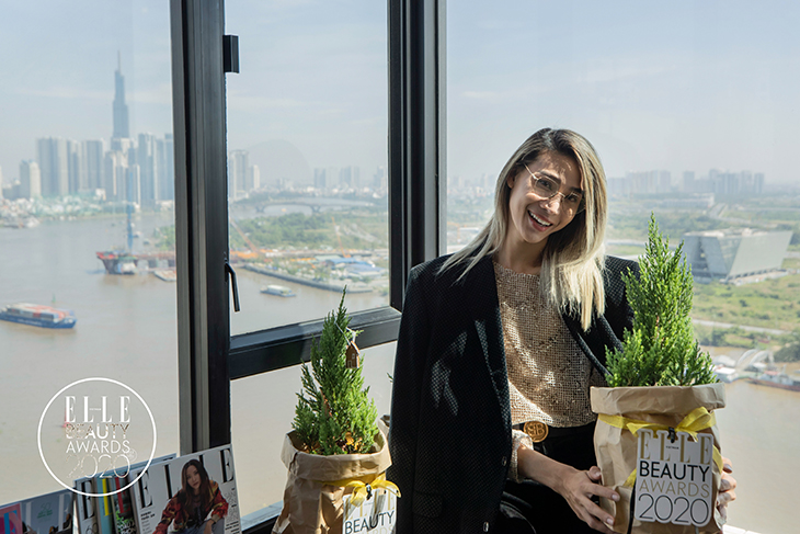 Người mẫu Mid Nguyễn tạo dáng bên quà lưu niệm của ELLE Beauty Awards 2020. Ảnh: DaiNgo Studio.