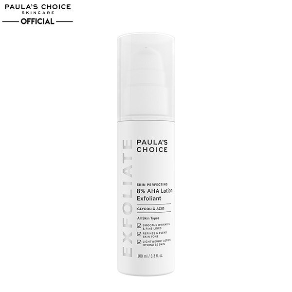 Tẩy Tế Bào Chết Hóa Học Đẩy Lùi Lão Hóa Paula's Choice Skin Perfecting 8% AHA Lotion là sản phẩm loại bỏ tế bào chết AHA dưới dạng lotion giúp loại bỏ tế bào chết một cách dịu nhẹ, bổ sung độ ẩm, 8% Glycolic Acid, cùng các thành phần làm dịu làn da, chống oxy hóa và các loại dầu thực vật làm da da trở nên mịn màng