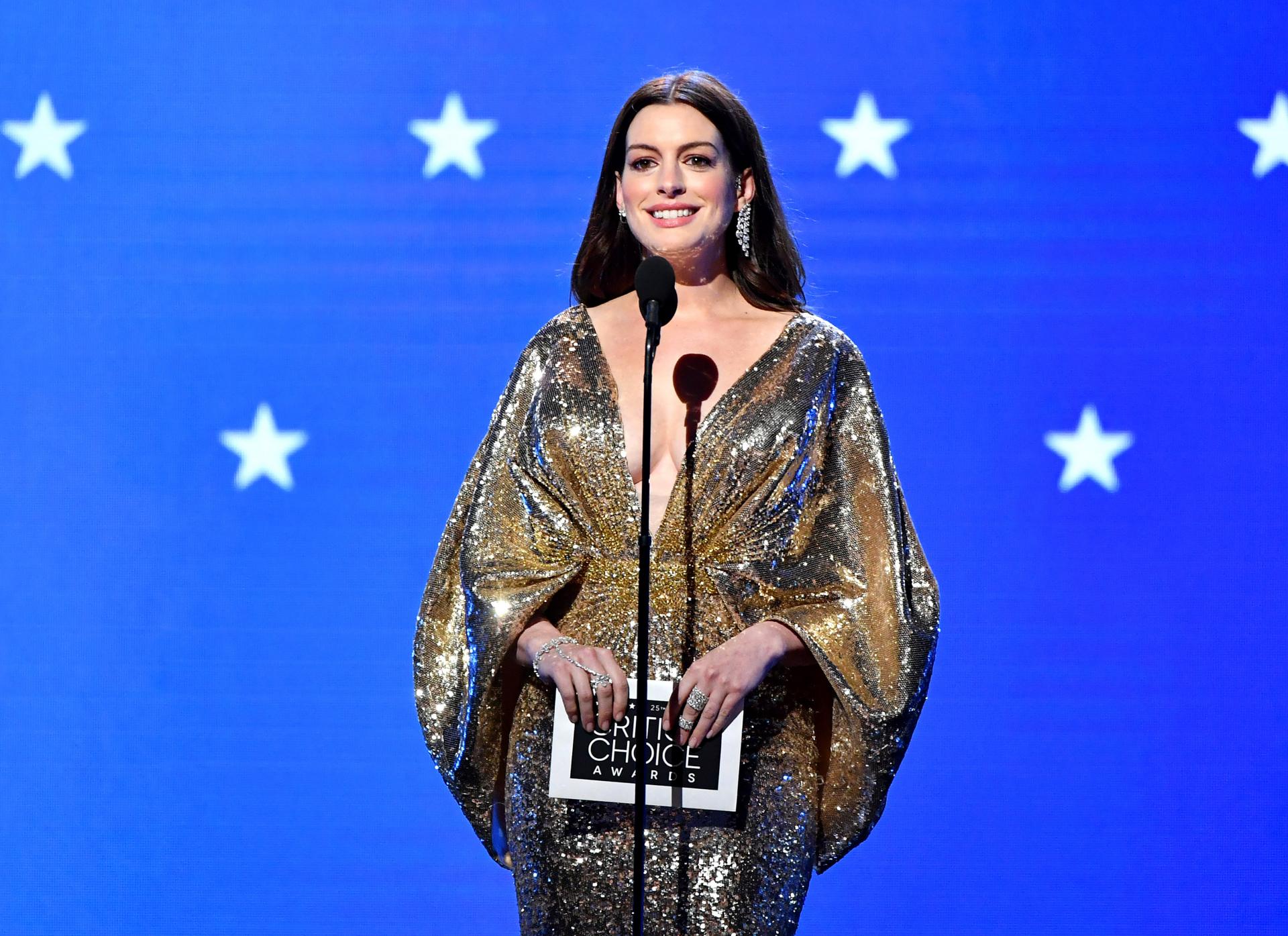 Anne Hathaway phát biểu tại Lễ trao giải Critics’ Choice Awards, diễn ra vào ngày 12/01/2020 ở nhà hát nghệ thuật The Barker Hangar, Santa Monica, California, Mỹ. Ảnh: Getty Images.